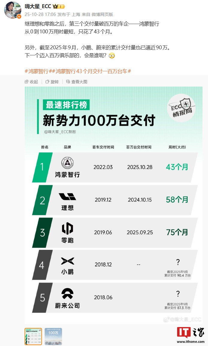 IT之家10月28日消息,继理想和零跑之后,鸿蒙智行今日官宣全系车型交付突破100万台。汽车销量数据追踪和分析团队ECC情报局的博主@嗨大星_ECC今日分享了新势力100万台交付最速排行榜纯旭配资端,鸿蒙智行、理想、零跑位列该榜前三。